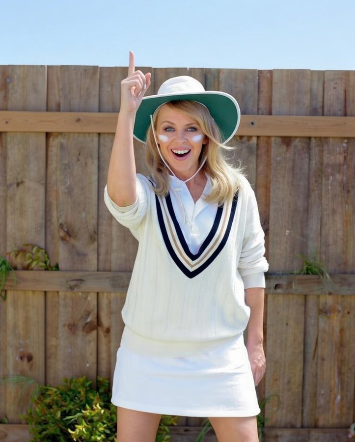 Kylie Minogie poses as an umpire in a picture shoot for a UK-targeted promotion for Tourism Australia in 2019.