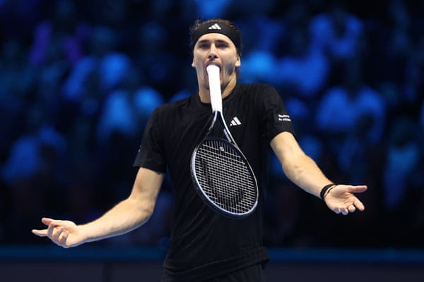 The following week Alexander Zverev questions a line call during his group match against Jannik Sinner at the ATP Finals in Turin.