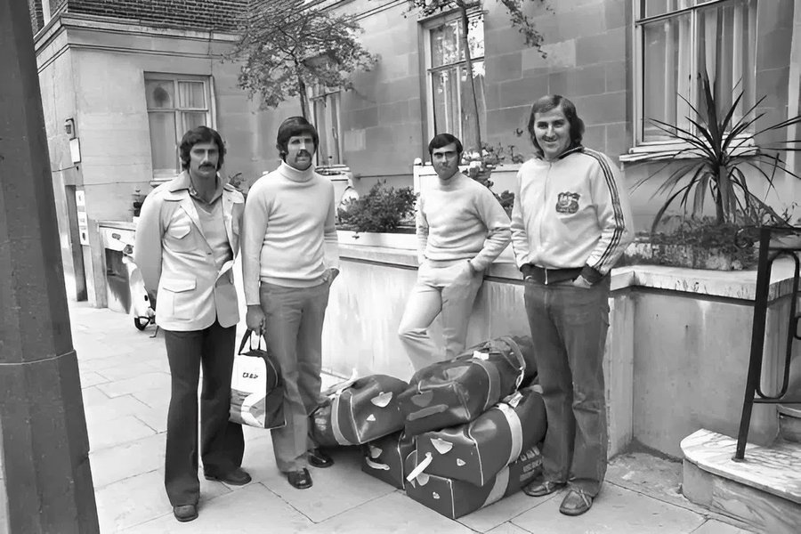 Call the fashion police. Dennis Lillee, Alan Hurst, Alan Turner and Gary Gilmour pose outside their London hotel at the start of their 1975 tour.